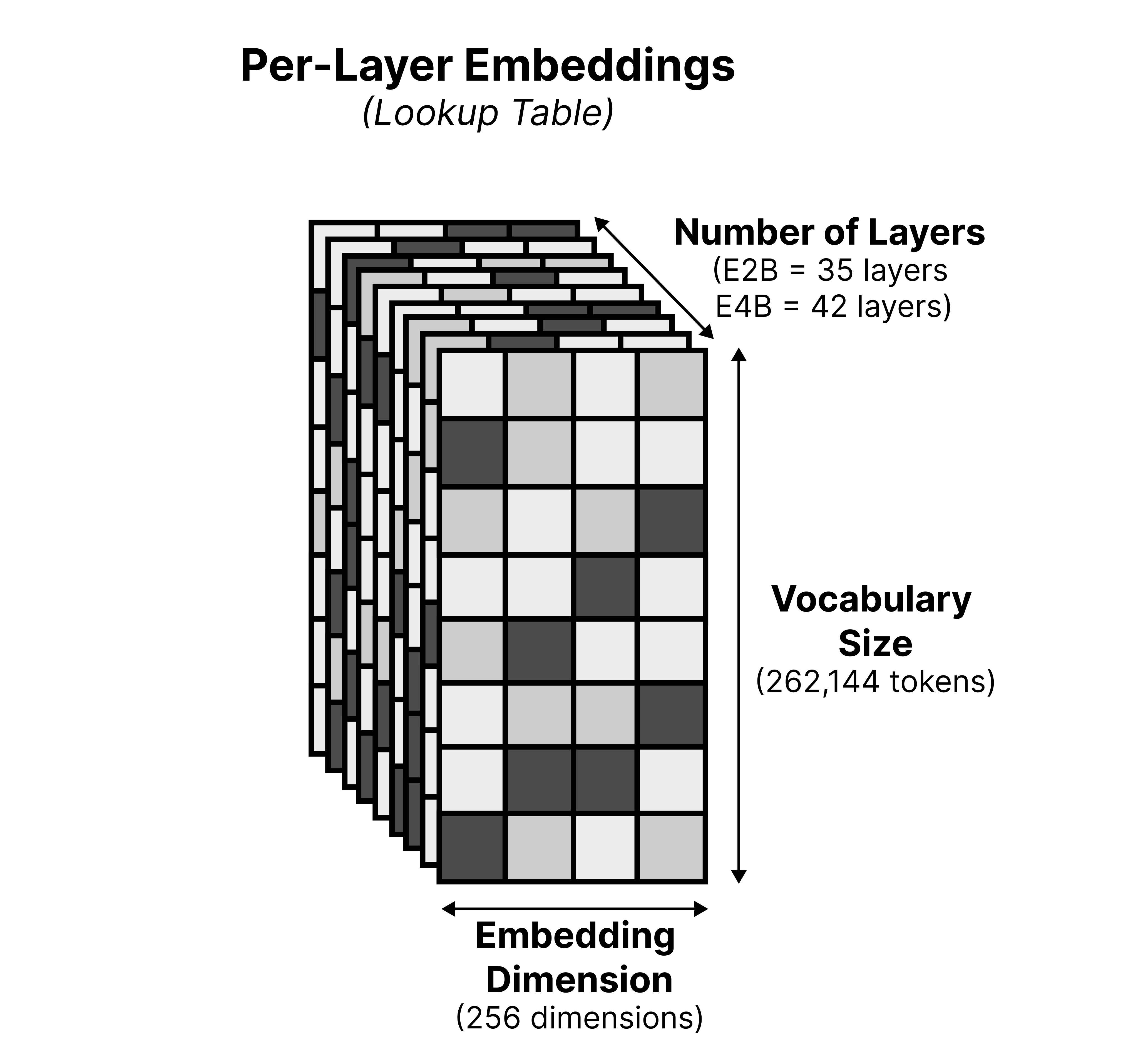 These embeddings are quite a bit smaller (256 versus 1536 dimensions in E2B and 2056 in E4B) than the original lookup table to save storage. As a result, we now have a lookup table of 262,144 tokens x 256 dimensions x N layers. The benefit of having a larger lookup table is that we can store important information on flash storage rather than needing valuable (V)RAM which is meant for computations in the model.