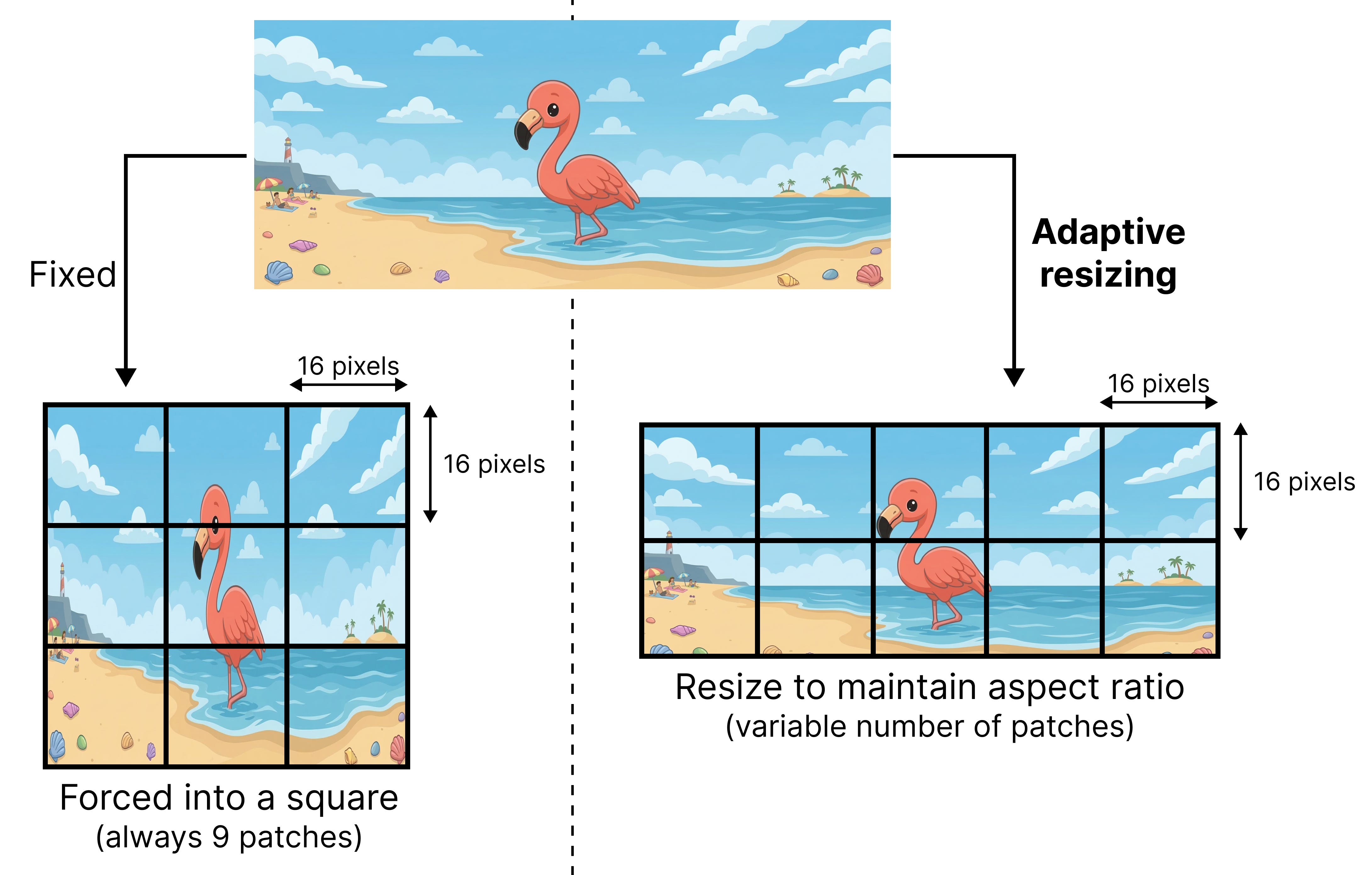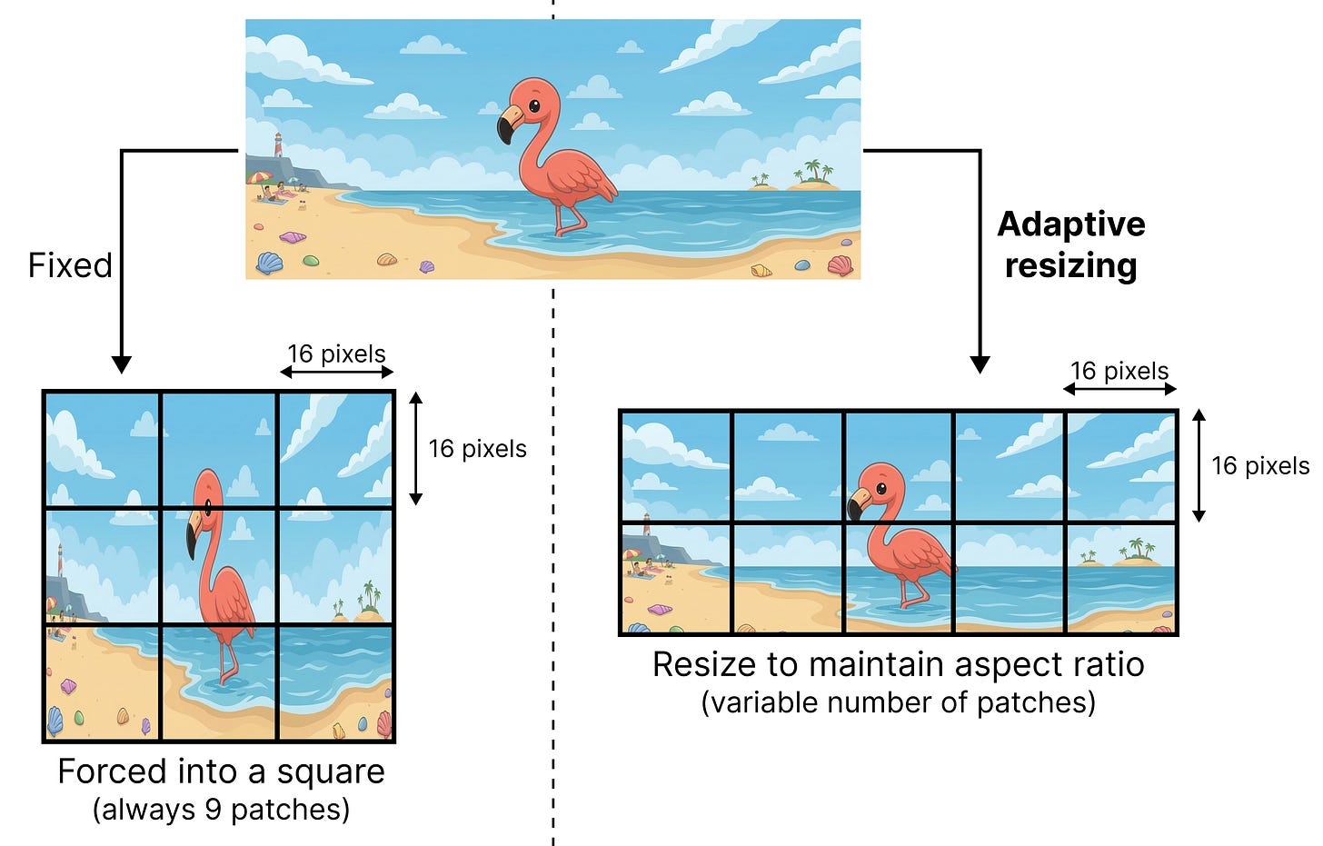 ViT assumes that the original image is a square that can be divided into patches of 16 by 16 pixels. However, there is a downside to this approach. When you process sequences of patches but the original image can be all different kinds of sizes, the position of a given patch (for instance patch 4) can mean different things depending on the proportion of the original image. For instance, if we assume that the original image will always be a grid of 3 by 3 patches, then patch 4 will always be in the middle. However, if the grid is dynamic and can be 2 by 4 patches for instance, then patch 4 will not be in the middle.