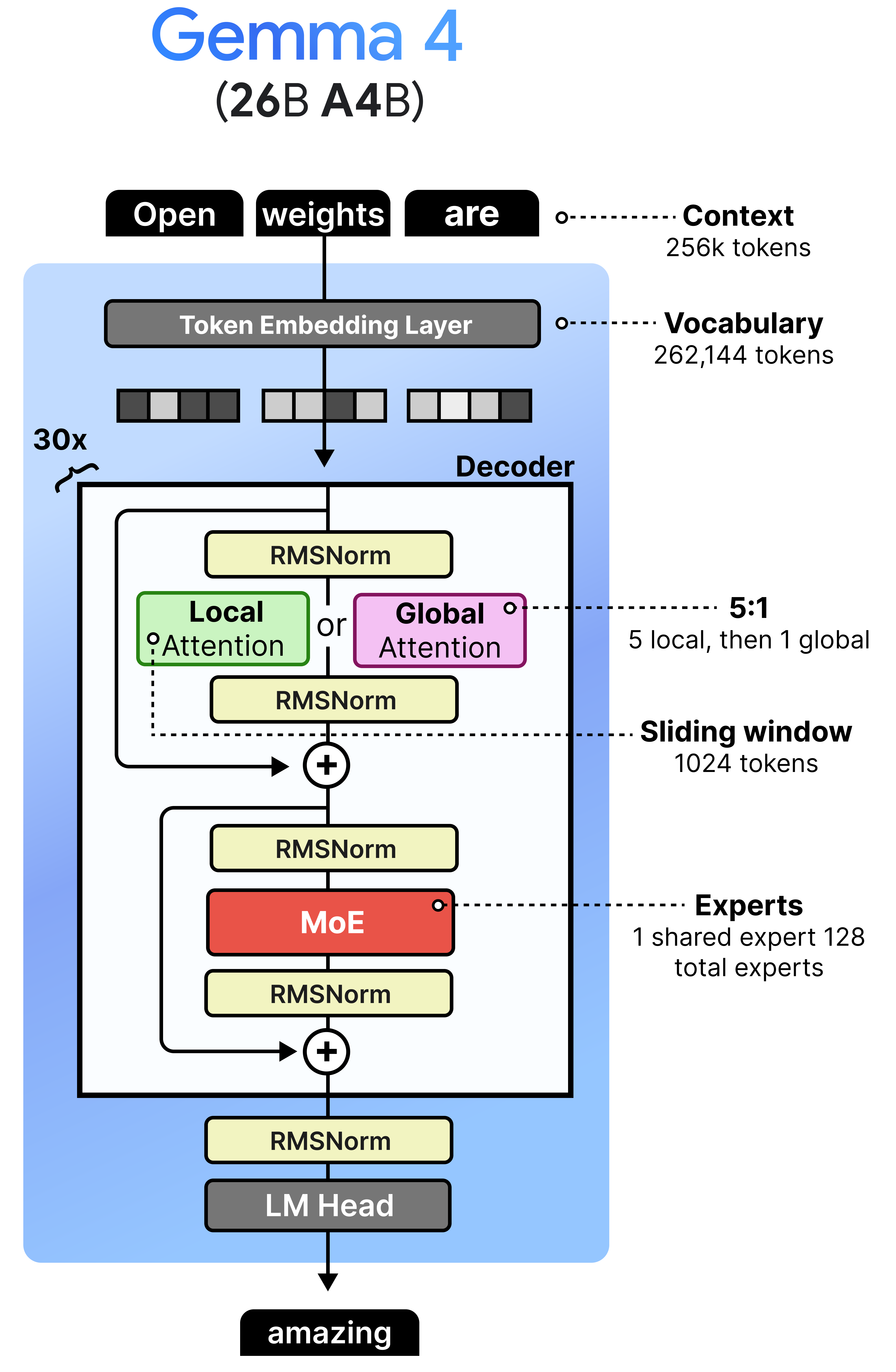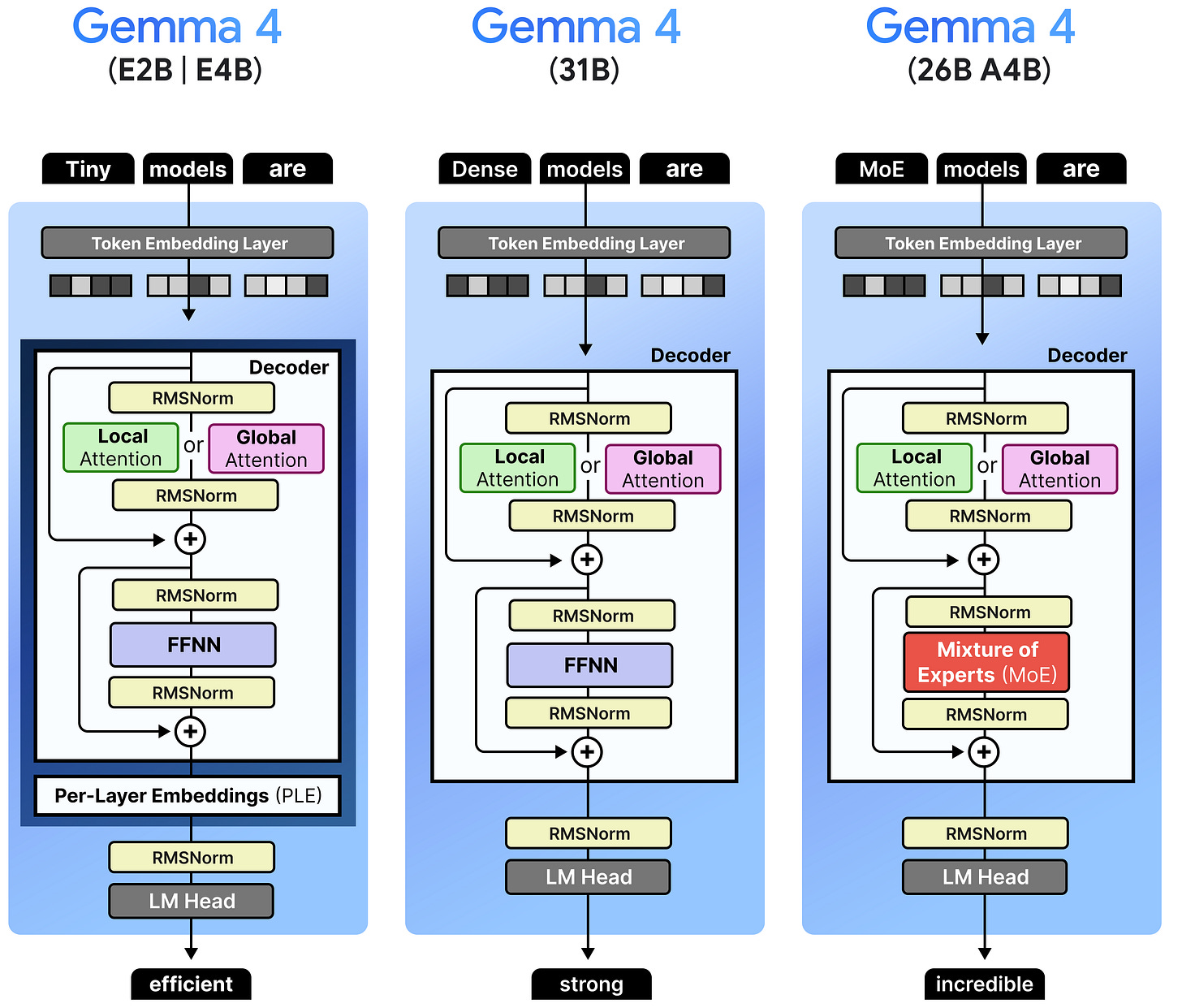 When we put everything together, the Gemma 4 architecture that all variants share, can be summarized into three major aspects: