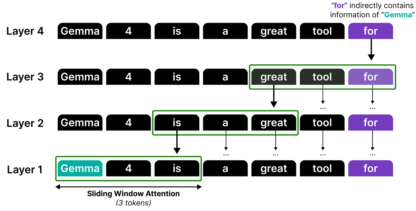 You typically fix the number of tokens it can see previously. In the case of Gemma 4 models, the smaller models (E2B and E4B) have a sliding window of 512 tokens and the larger models (26B A4B and 31B) have a sliding window of 1024 tokens.
