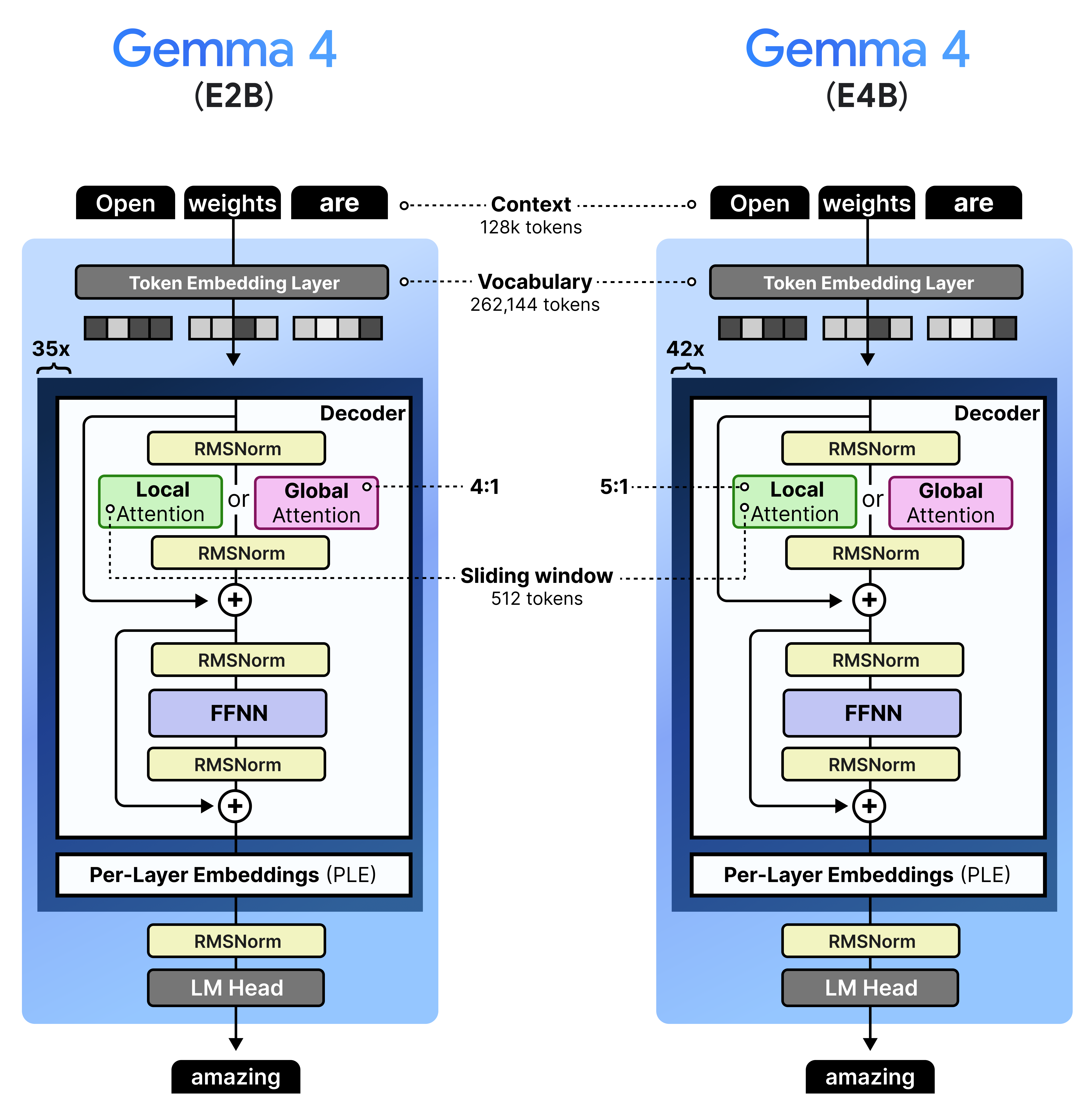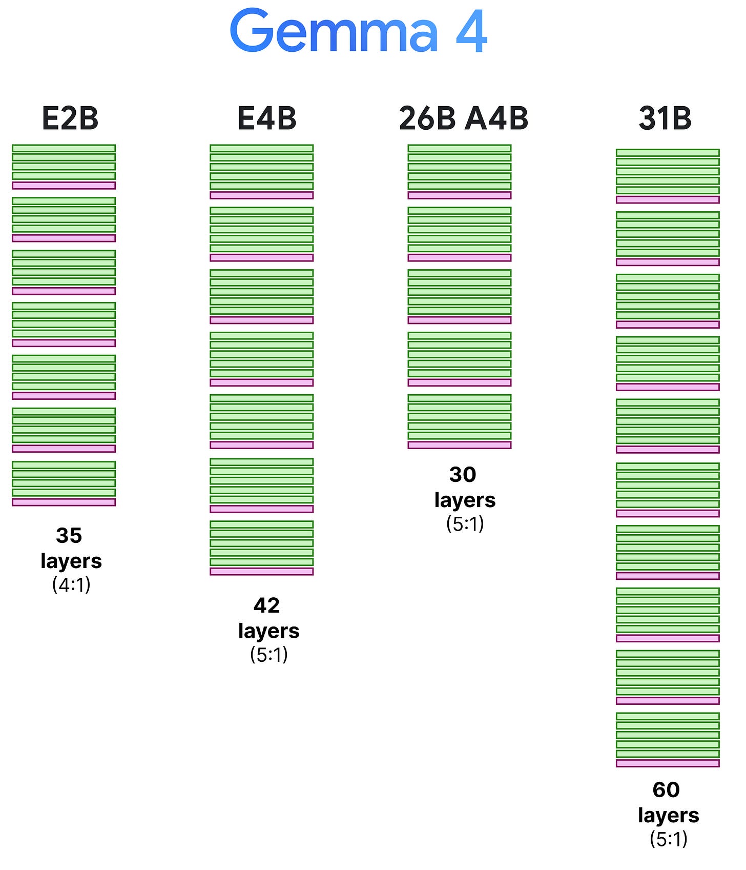 The 4:1 pattern, however, is only for the E2B as all other variants have a 5:1 pattern where they start with 5 layers of local attention followed by a single layer of global attention. We can visualize this pattern side-by-side to also demonstrate the depth of these models.