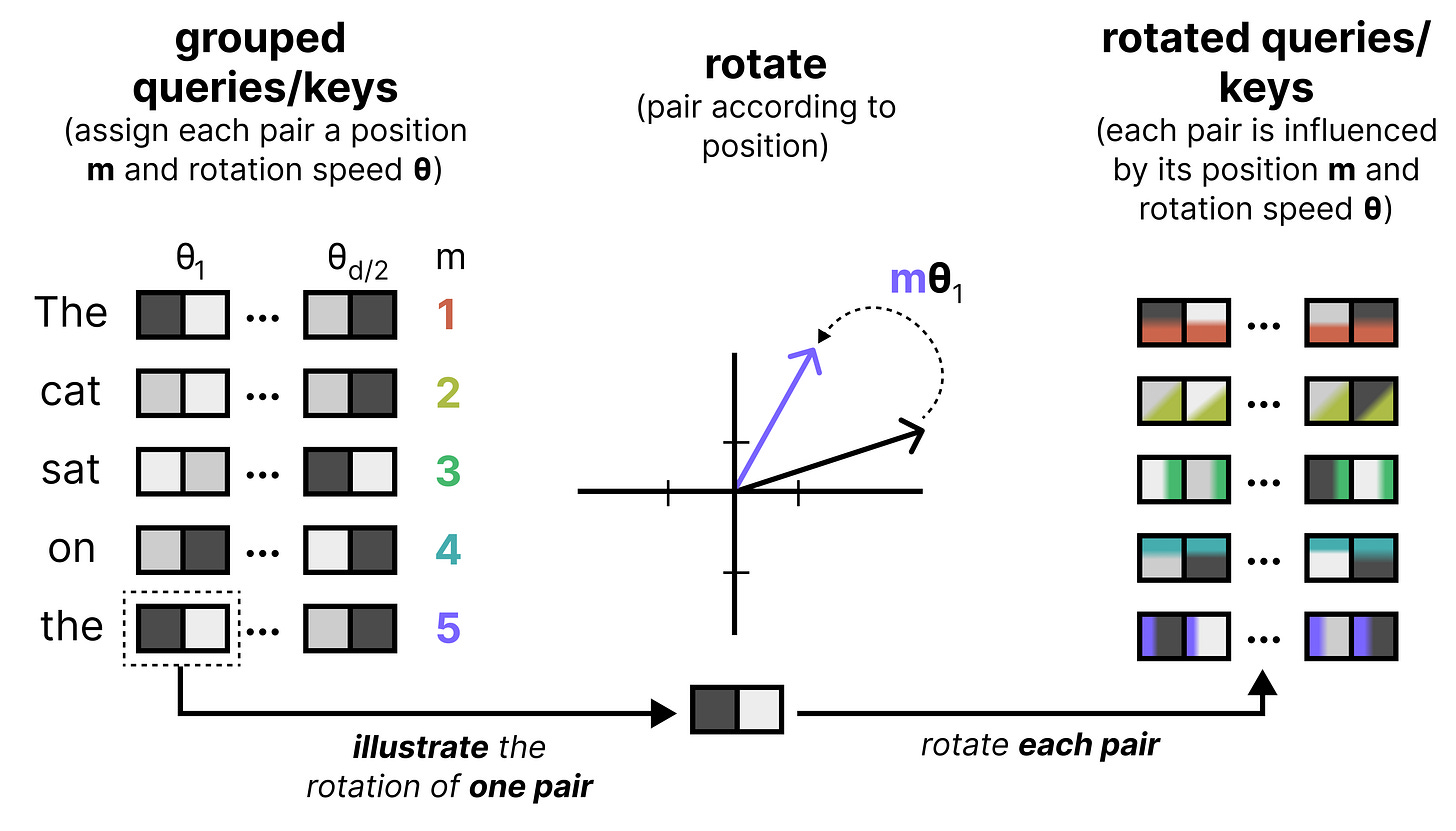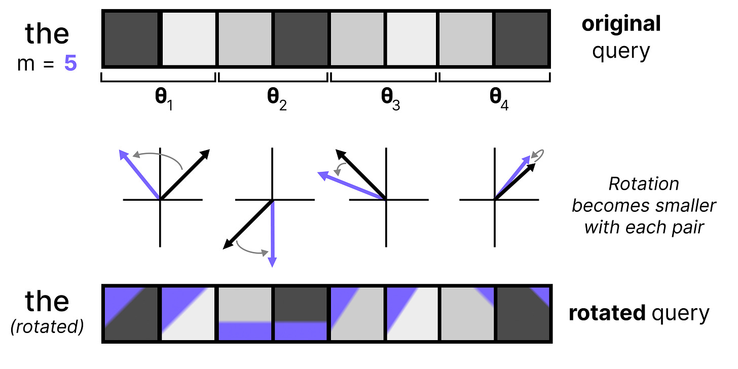 An important component of any Large Language Model is how it keeps track of the order of words in a sequence. One of the most common techniques is called Rotary Positional Encodings (RoPE). RoPE takes the Query and Key vectors and slices them up into pairs of two values. Each pair can now be seen as a vector in 2-dimensional space pointing towards a direction. RoPE rotates this direction slightly for each pair of values at decreasing speeds. The first pair has a large rotation compared to the last pair. This rotation allows the model to track the relative distances between words.