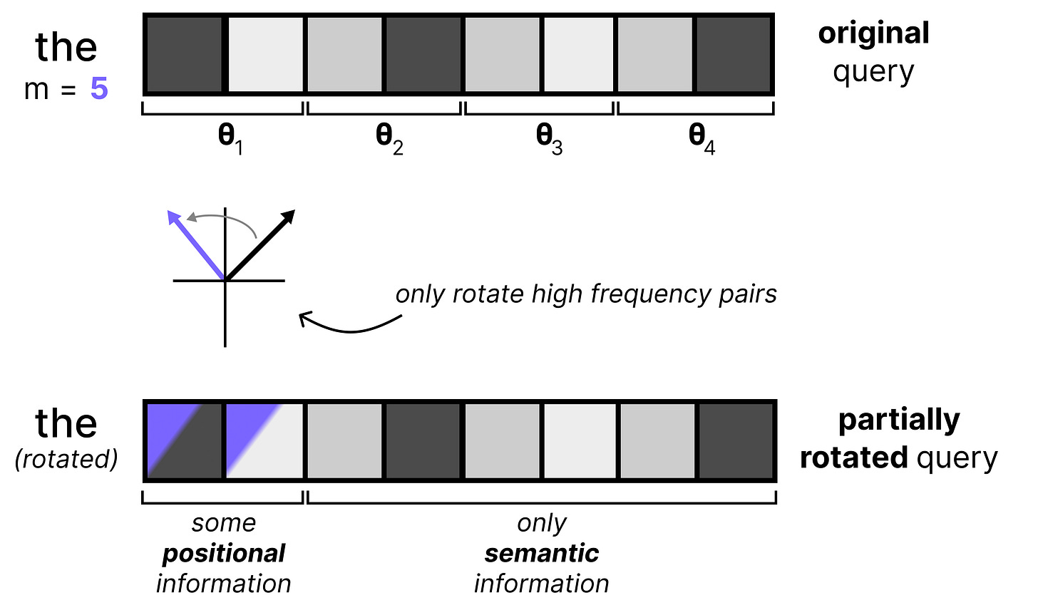 An elegant solution to this problem is by simply applying RoPE to only some of the dimensions of all vectors, which is called p-RoPE. If p is 0.25, then only the first 25% of pairs get positional information and all other pairs are set to 0. This allows the low frequency pairs to preserve meaning.