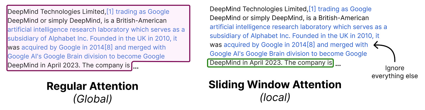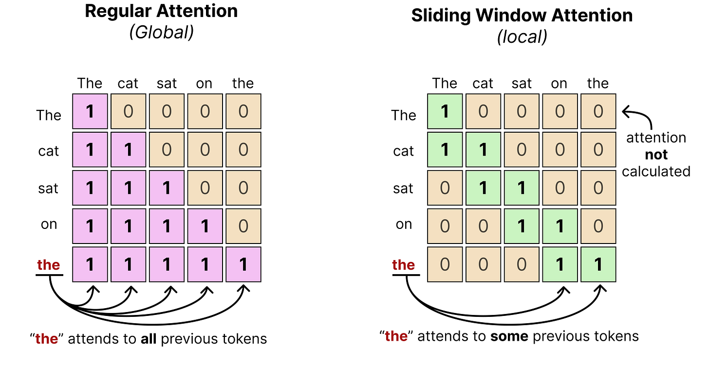 Remember that in global attention, every token attends to all tokens that came before it. Sliding window attention, however, only attends to tokens within a certain limit. This significantly reduces the compute needed to calculate the full attention.