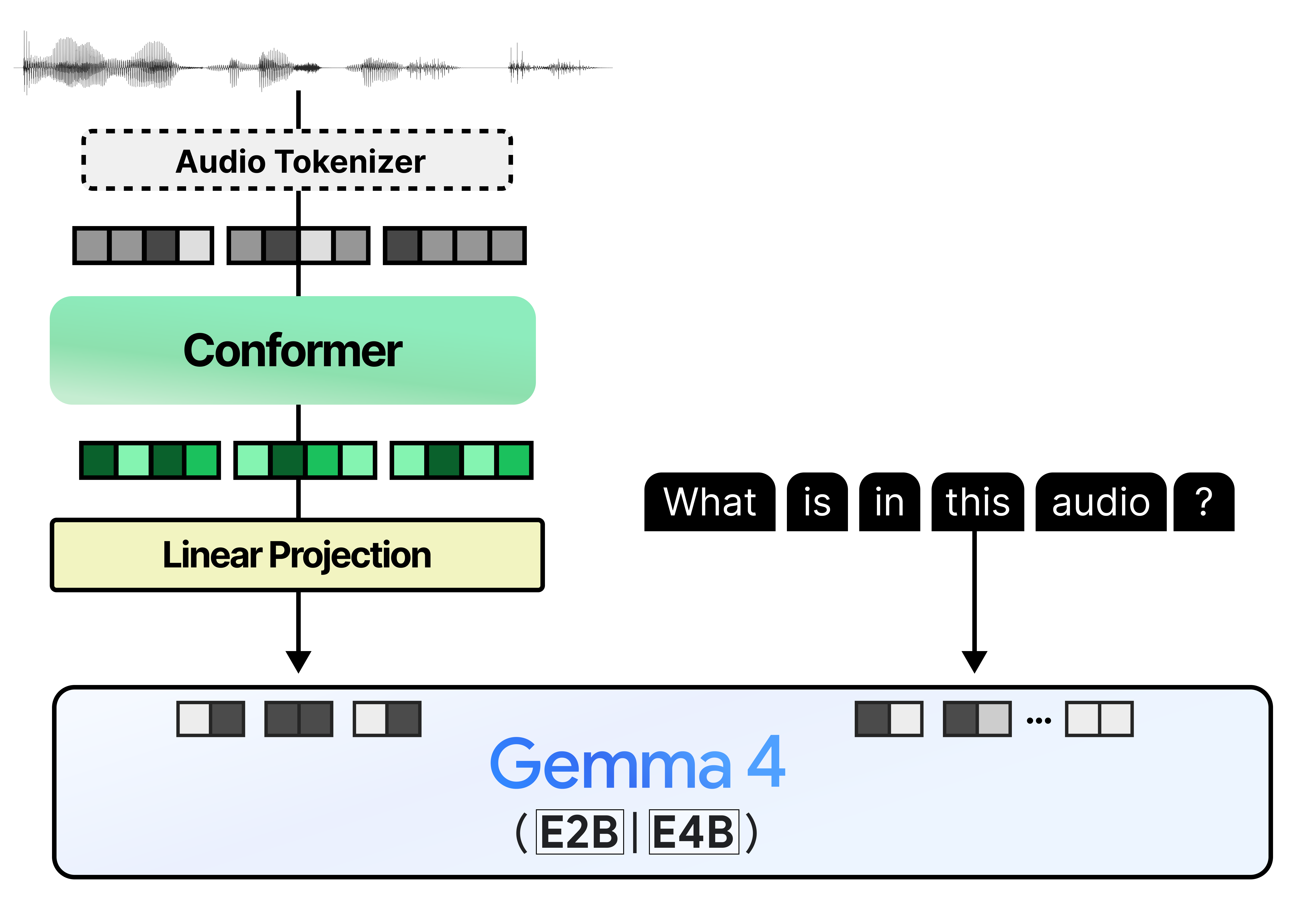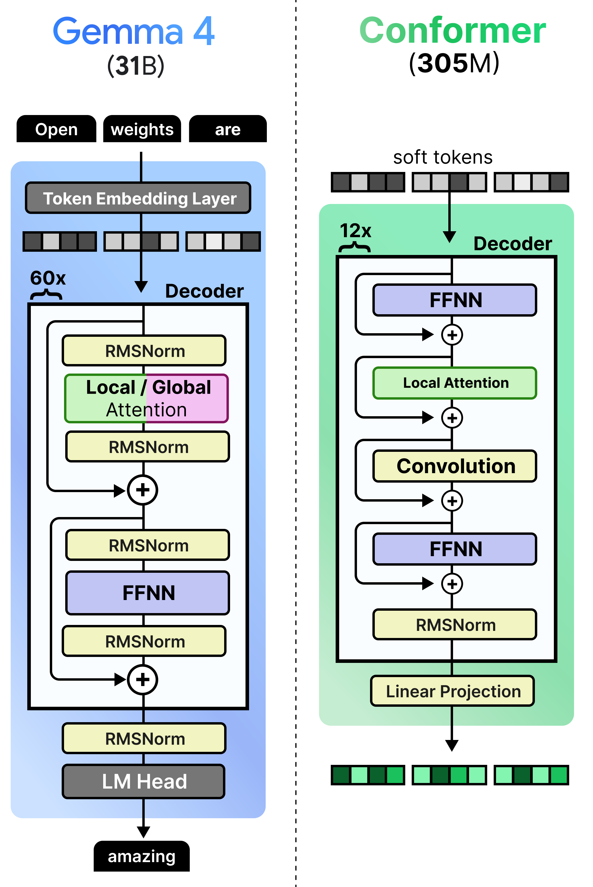 This process is much like the linear projection of the image patches to create embeddings. They still need to be processed subsequently by an encoder so that the embeddings are filled with contextual information. The audio encoder used in Gemma 4 is called a conformer and is much like a regular Transformer Encoder but also uses a convolutional module to process the soft tokens. A nice comparison is between the dense Gemma 4 31B and how the Conformer is implemented. Note how it produces embeddings rather than tokens.