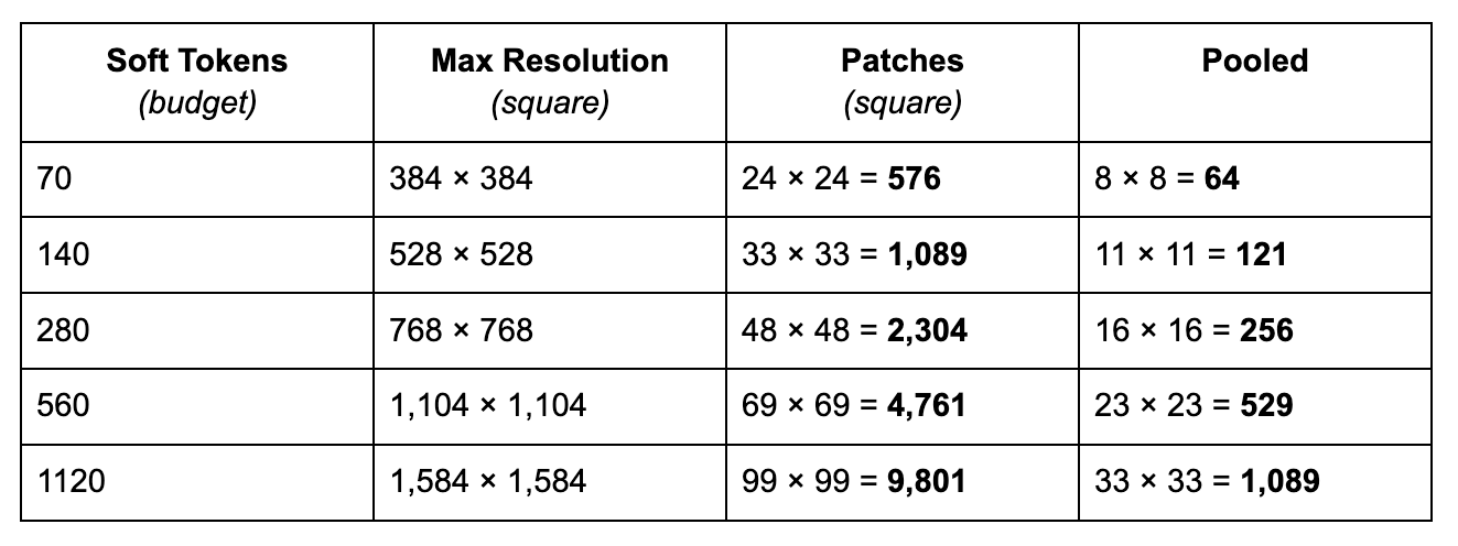 Gemma 4 supports different resolutions by introducing a soft token budget. This budget represents the maximum number of patch embeddings (also called soft tokens or visual tokens) are passed to the LLM to process. The user can decide between budget sizes of 70, 140, 280, 560, or 1120 tokens.