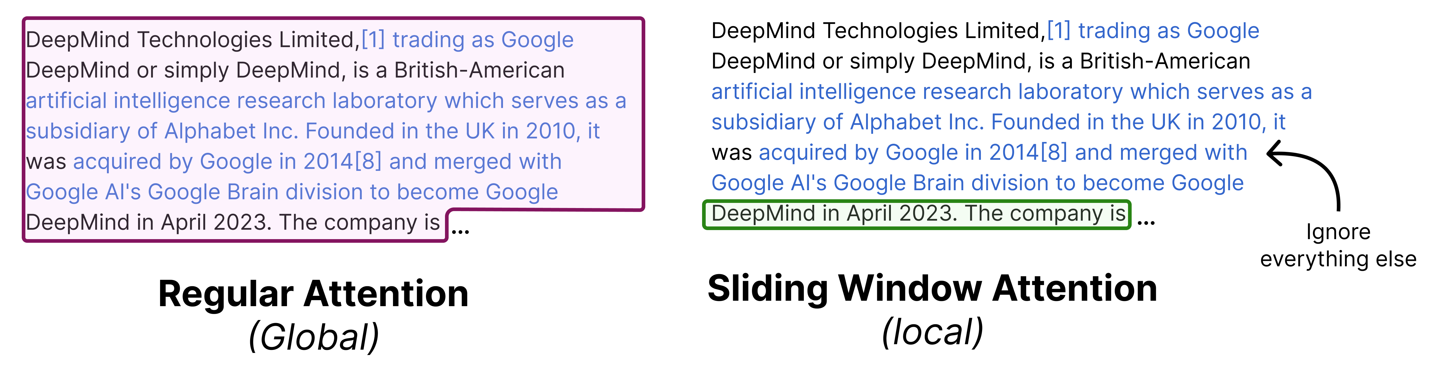 In our example, there is only attention given to the last four tokens which at some point in the generation starts to “ignore” the ones that came before that. However, it is actually not forgetting the representations that it calculated in the previous steps. The hidden states allow for the attention to be passed along the attention mechanism from previous layers and steps all the way to the current token.