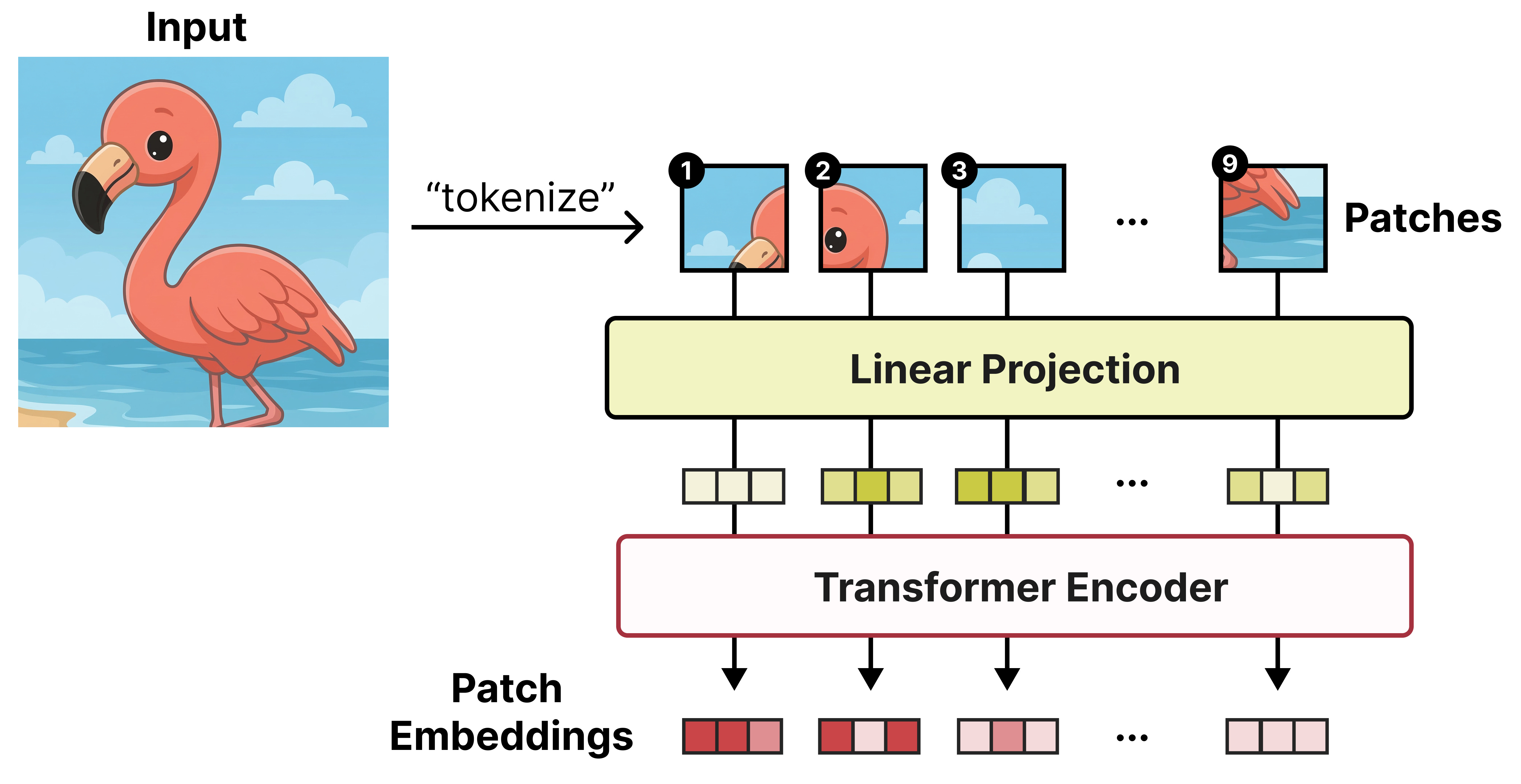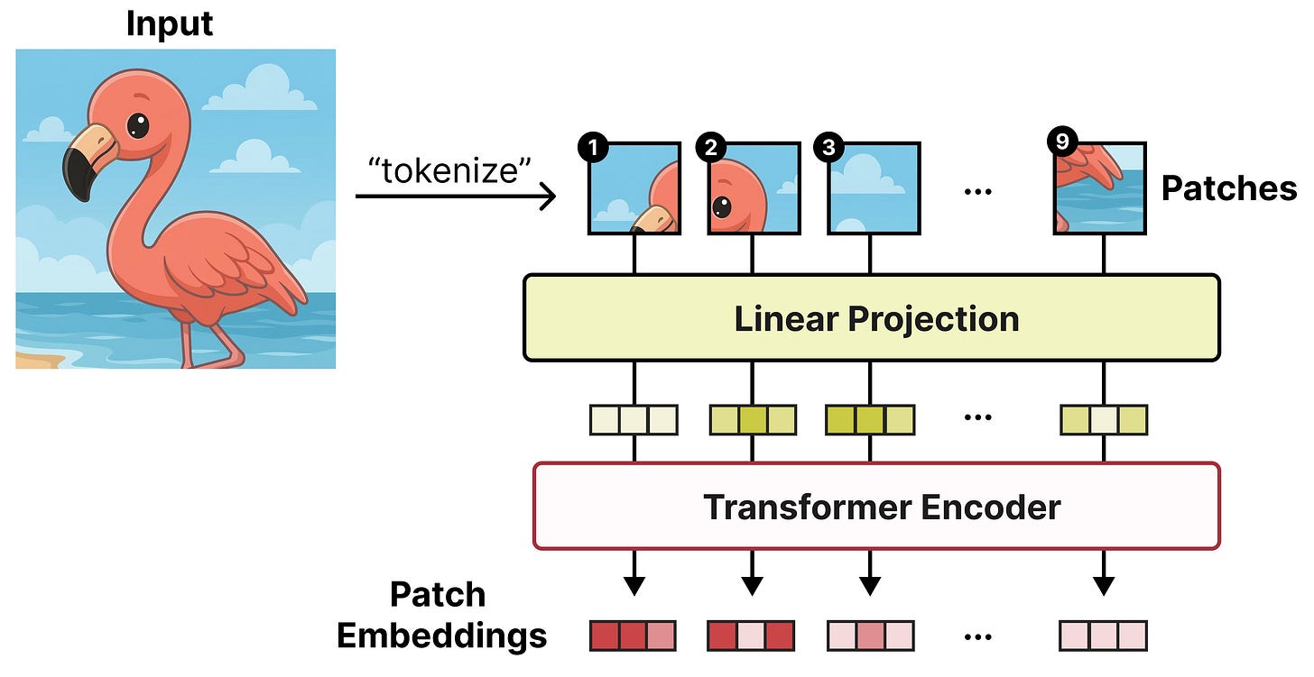 What makes this possible is a Vision Encoder based on the Vision Transformer (ViT) to process the images. A ViT works similarly to a regular Large Language Model and instead of tokenizing text into sequences of words, it splits up the input image into sequences of patches. Each patch (a subset of the input image) is then passed a Transformer model which spits out an embedding per patch.