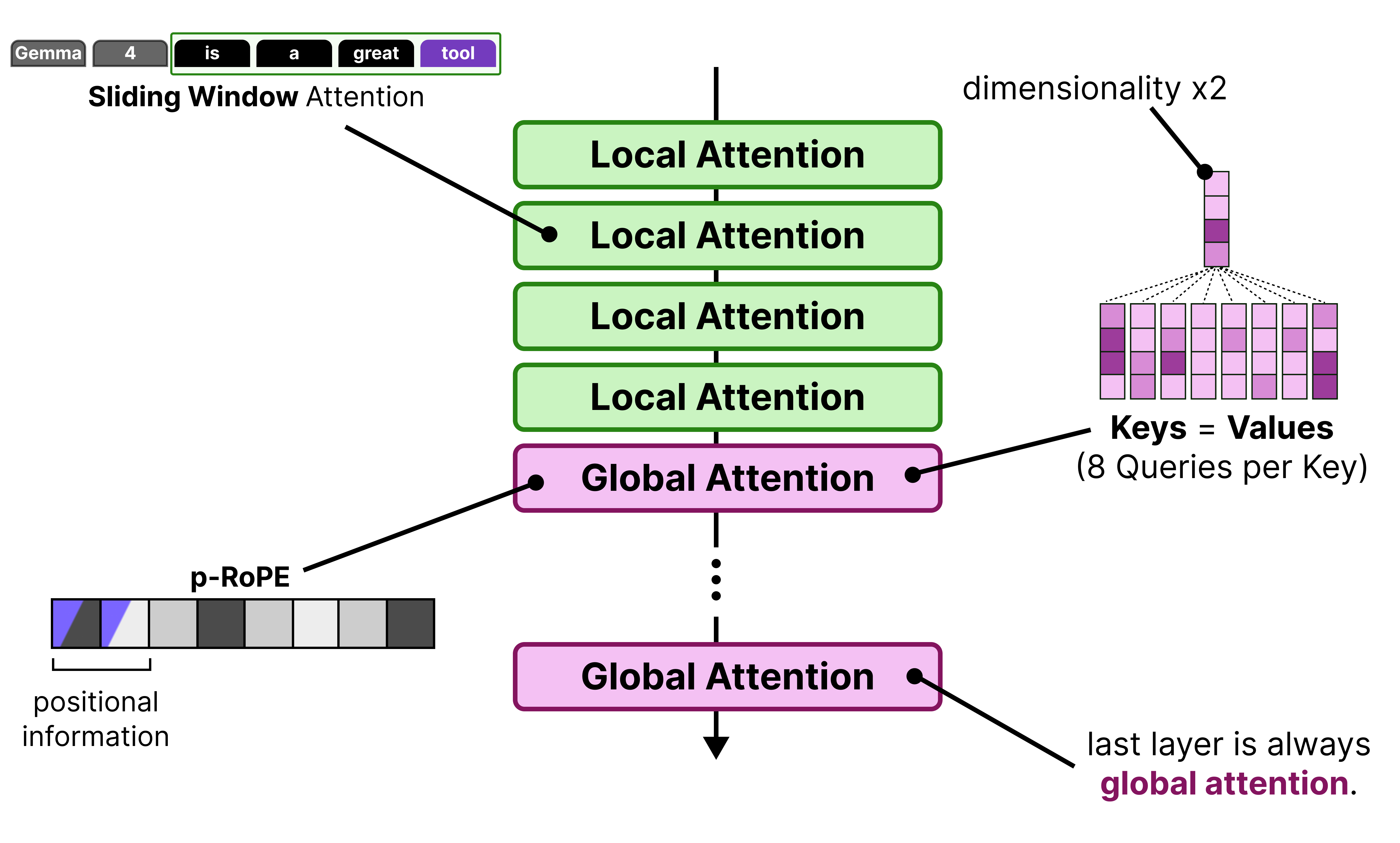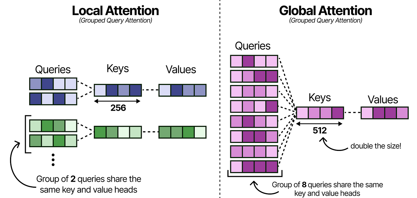 Much like Gemma 3, these models use Grouped Query Attention (GQA) which allows the Query heads to share KV-values which reduces the amount of caching that needs to be done. The local attention layers use GQA and have 2 Query heads sharing one KV head.