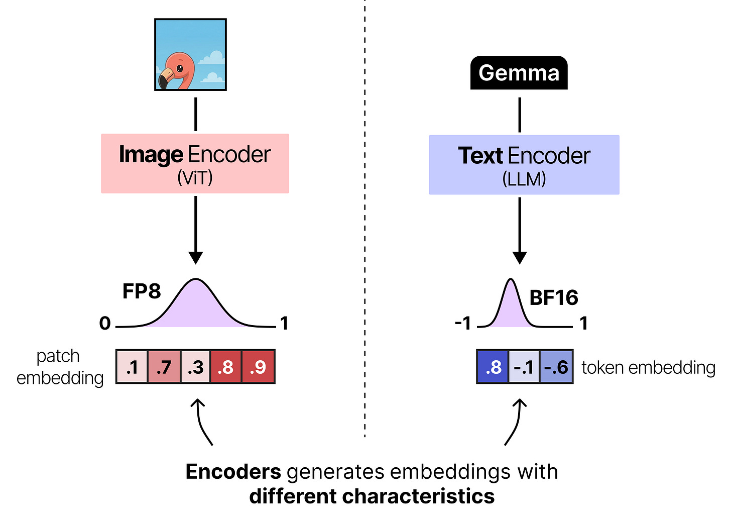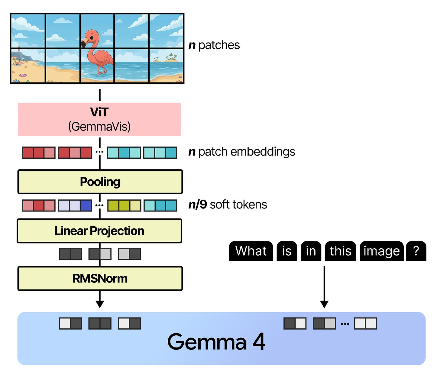 To make sure that the patch embeddings are aligned correctly with the token embedding the patch embeddings are typically projected using a small neural network so that they have the same dimensions and value distributions as what the language model expects. In Gemma 4, this projection is then followed by RMSNorm to match scale expectations of subsequent Transformer blocks.