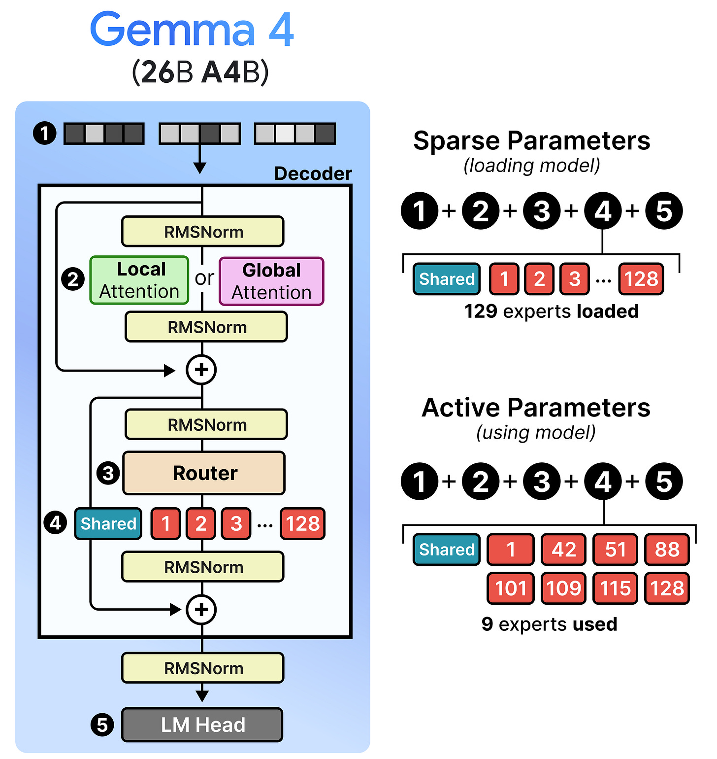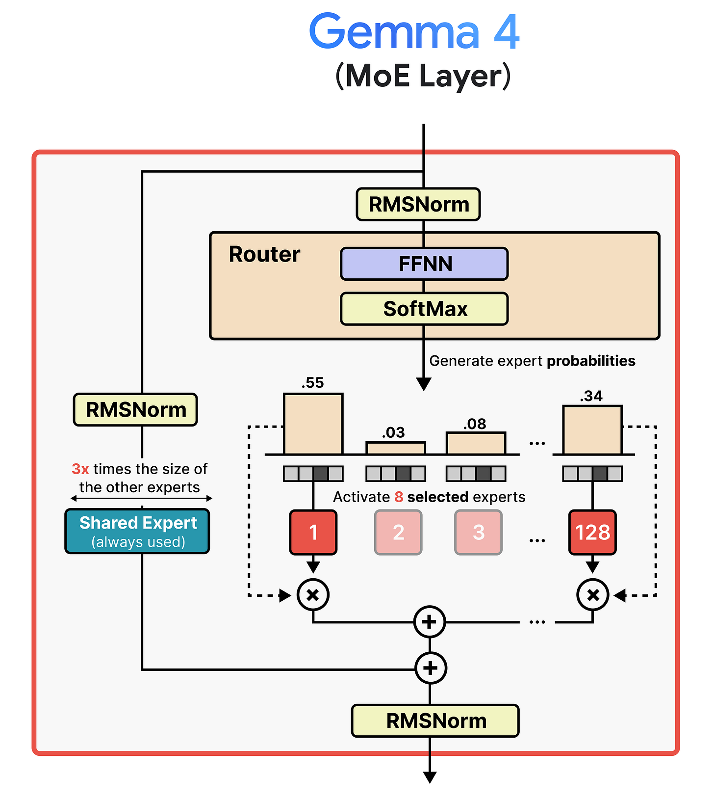 Although the visual shows a single expert, most MoE activate at least several and combine the result. In Gemma 4, the MoE variant has 128 experts that the router can choose from and 8 will be activated at a time.