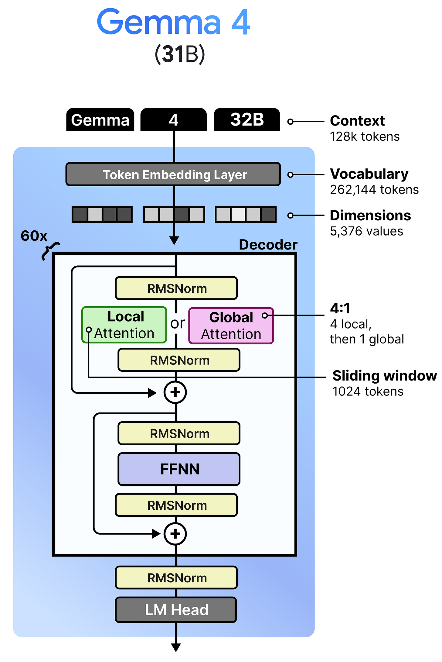 Despite the popularity of Mixture of Experts (which we cover later), the Gemma 4 family has a dense variant that is quite large with 31B parameters. This model is a nice representation of a more “vanilla” architecture amongst the Gemma 4 variants.