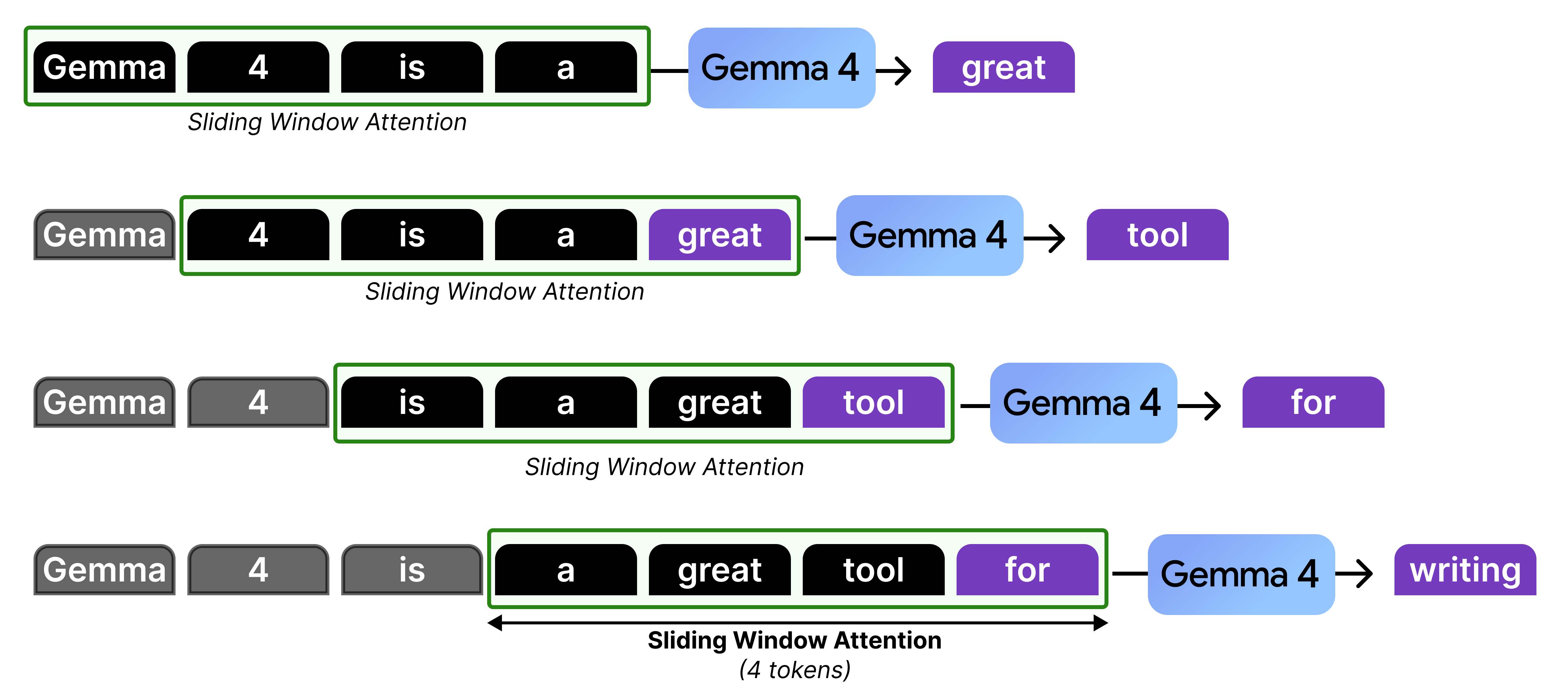 Let’s go through an example with a sliding window of 4 tokens to see what is happening at each token generation:
