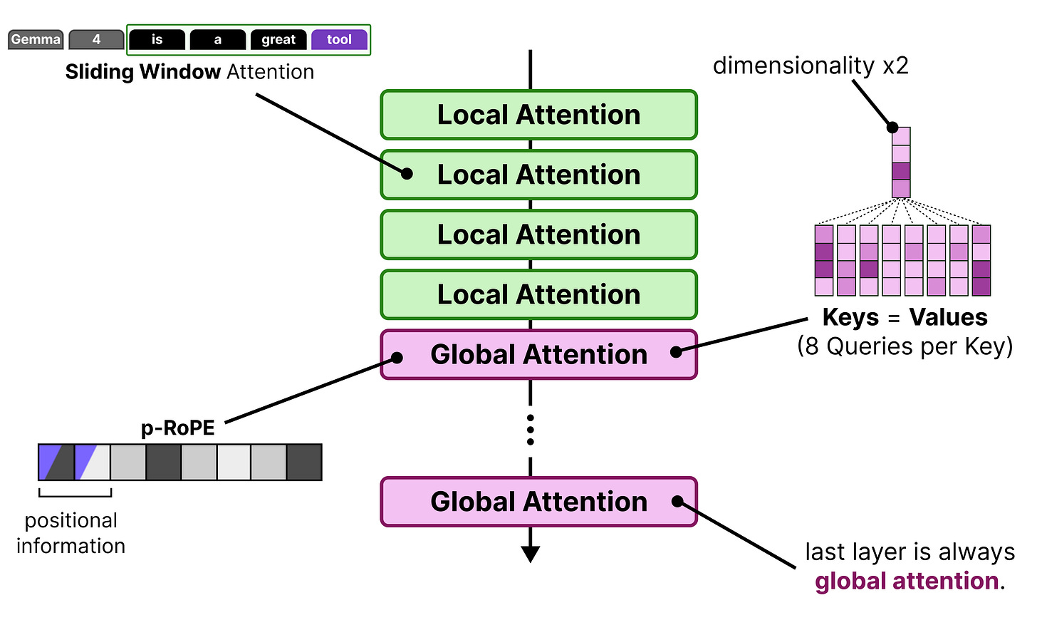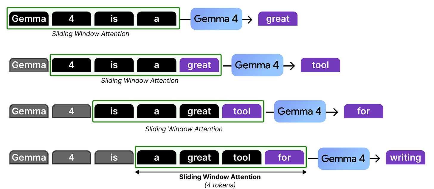 Like Gemma 3, Gemma 4 interleaves layers of local attention (also called “sliding window attention”) with global attention (which is regular or “full” attention).