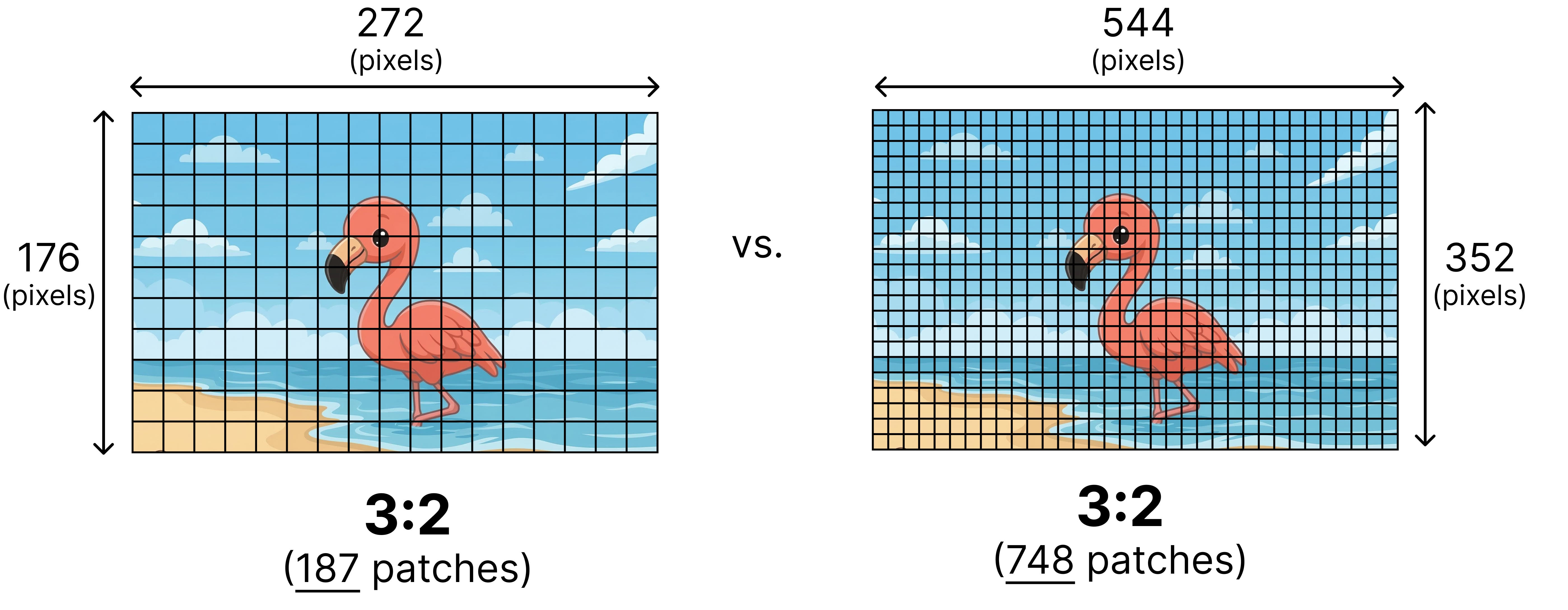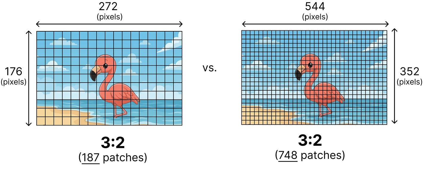 Although variable aspect ratios solve a bunch of problems, how do we decide the number of patches to use? Two images with the same aspect ratio can have different resolutions. Imagine you have two images with both an aspect ratio of 3:2 but one has a lower resolution of 272 by 176 and the other a higher resolution of 544 by 352.
