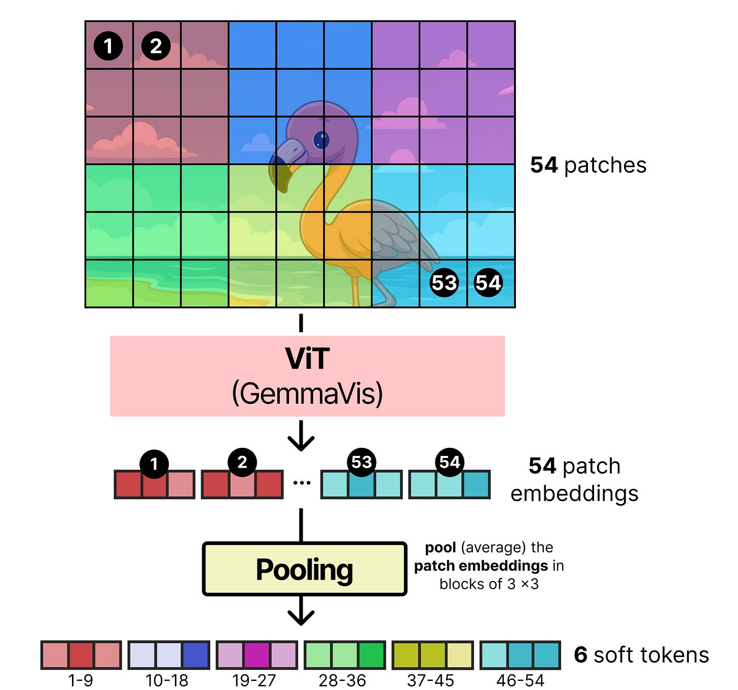 Below is an example of how an initially large number of patches gets averaged (also called pooling) into a lower number of patch embeddings (also called soft tokens).