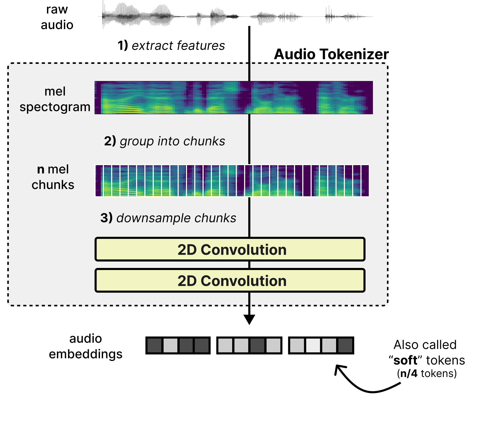 Downsample chunks - The chunks are overlapped and processed by two 2-dimensional convolutional layers to shorten the sequence length. As such, it converts the 2D chunks into a sequence of embeddings (also called “soft” tokens to represent the continuous nature of the token).