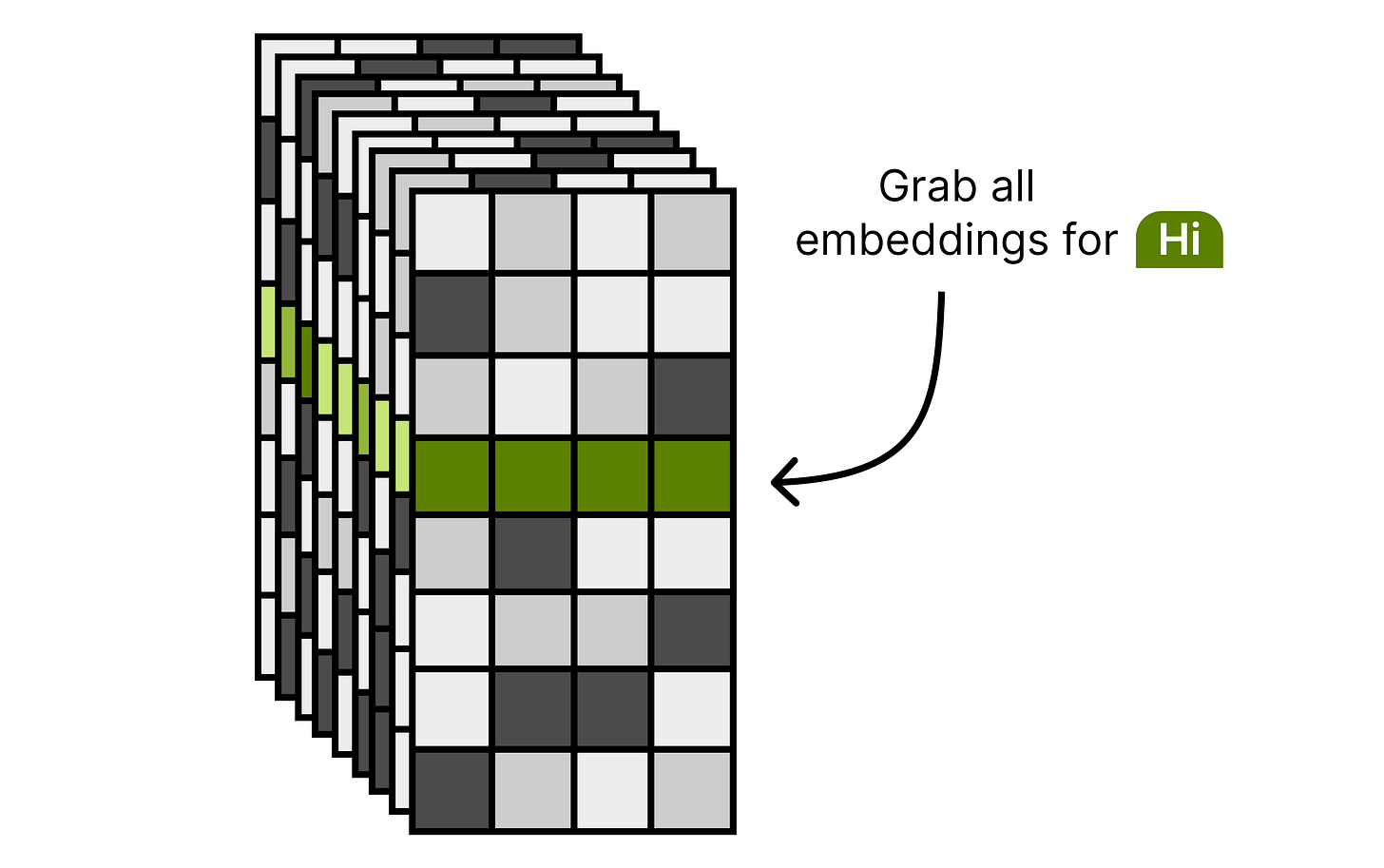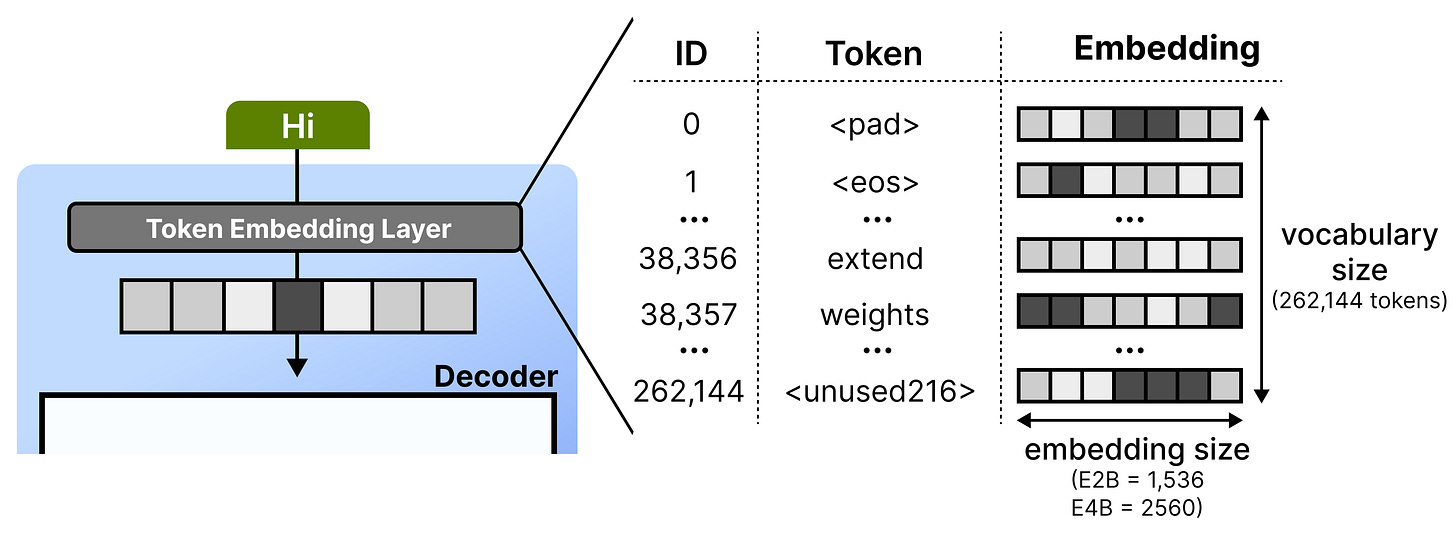 To explore what this means in practice, let’s first cover what happens at the token embedding layer. Whenever it receives a given token, it looks up its embedding using a lookup table. This table can be quite large since it has to store an embedding for each word in its entire vocabulary. Gemma 4 E2B, for instance, has 262,144 tokens each with an embedding size of 1536 dimensions.