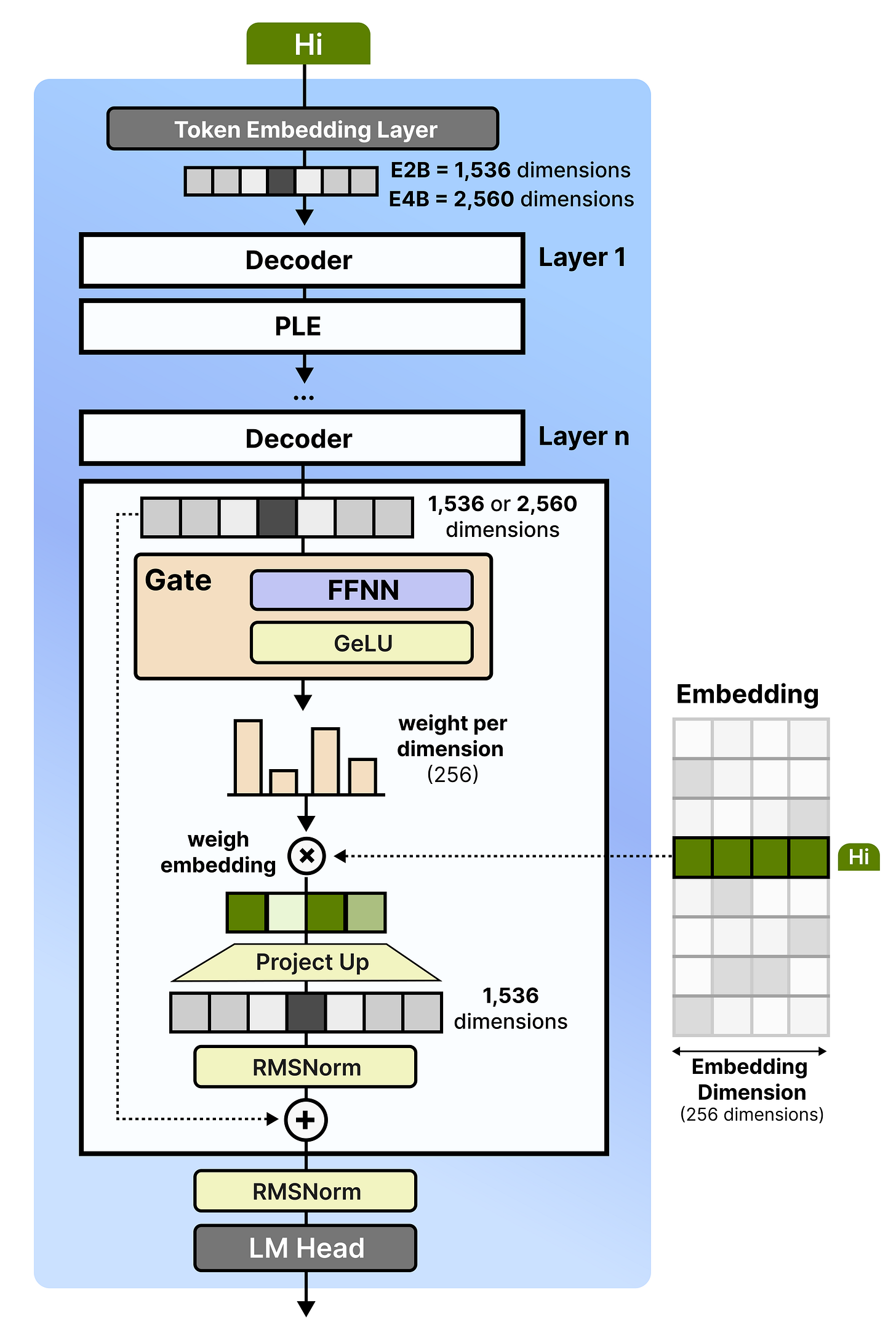 These embeddings are processed between each set of decoder blocks. Here, are gating function is used to decide how to weigh each value in a chosen embedding. This allows the model to additionally focus on certain parts of the embedding retrieved from the lookup table. The resulting embedding, still of dimensionality 256, is then projected up to match the original embedding size (1,536 for E2B and 2,560 for E4B).
